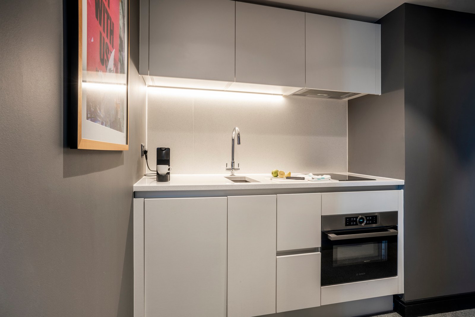 Book your stay today for your corporate relocation, family holiday or group vacation to London. Each Superior Studio comes with a hob, oven/microwave, fridge, freezer, washer/dryer, dishwasher, workspace, relaxing seating area, and carefully curated artwork. We also welcome your pets, with a pet-friendly policy in place. Unwind on our 5th-floor outdoor terrace, or in the Members’ Lounge, furnished with Mid-Century pieces and artwork curated by Maddox Gallery.
