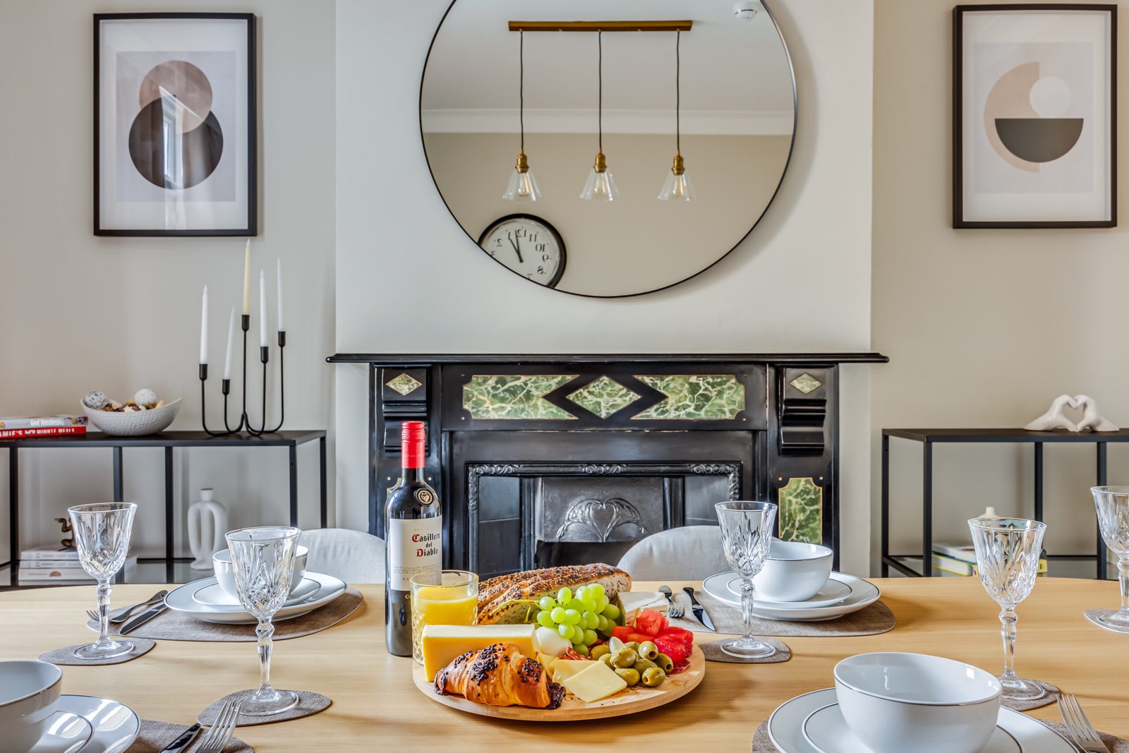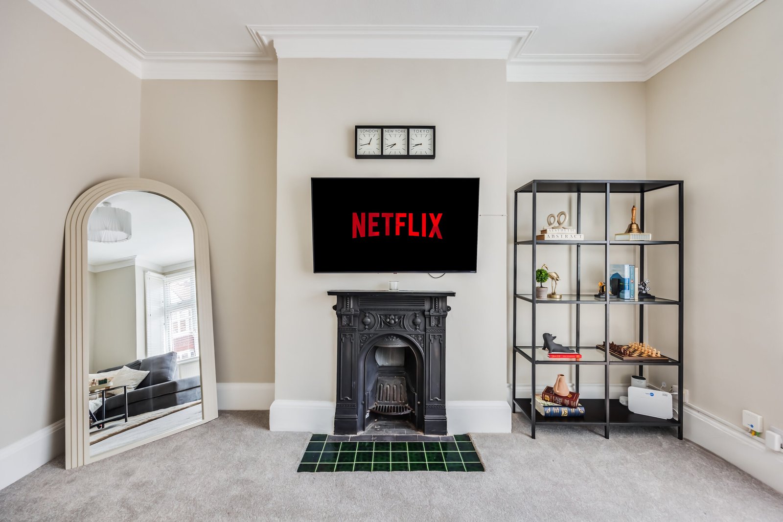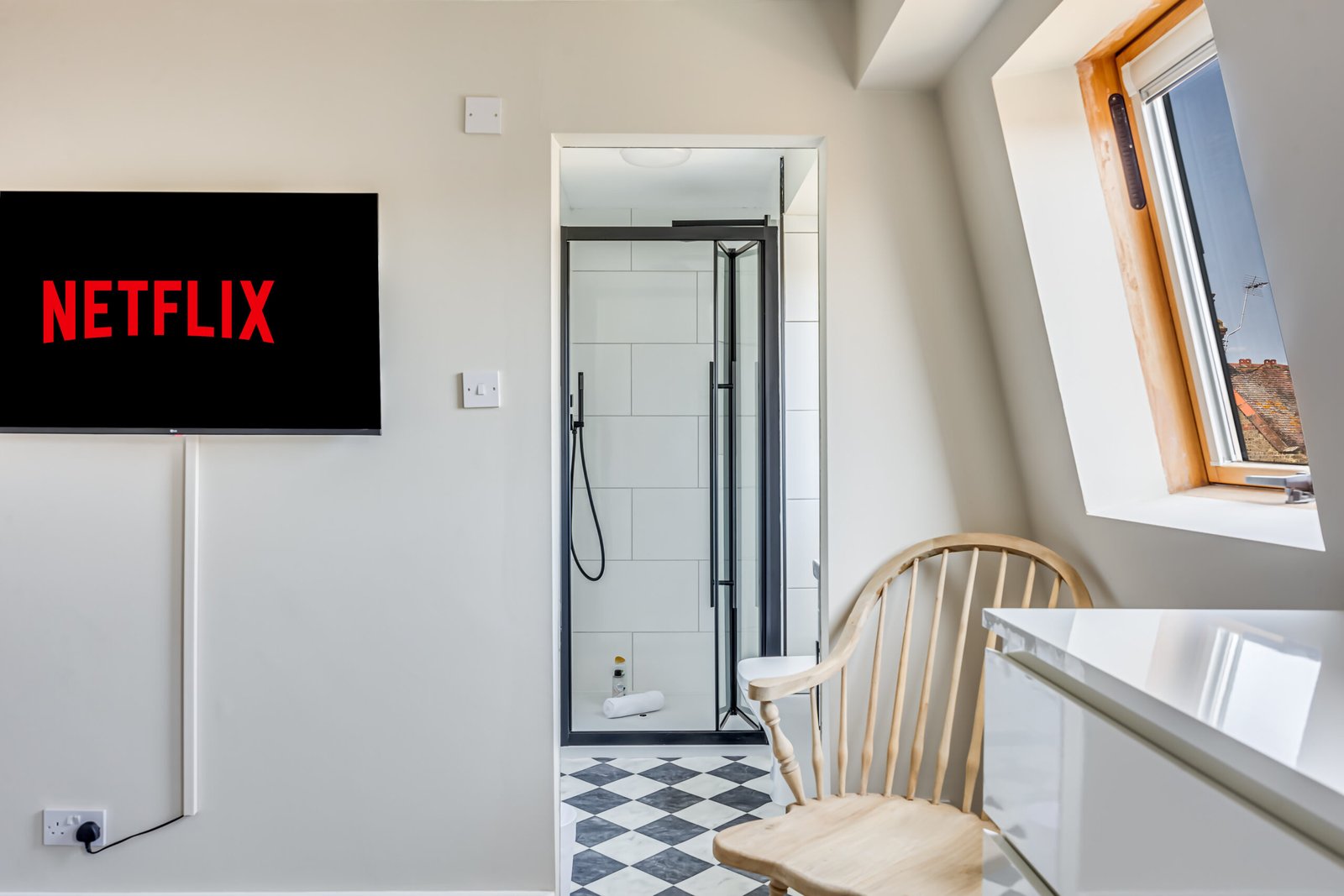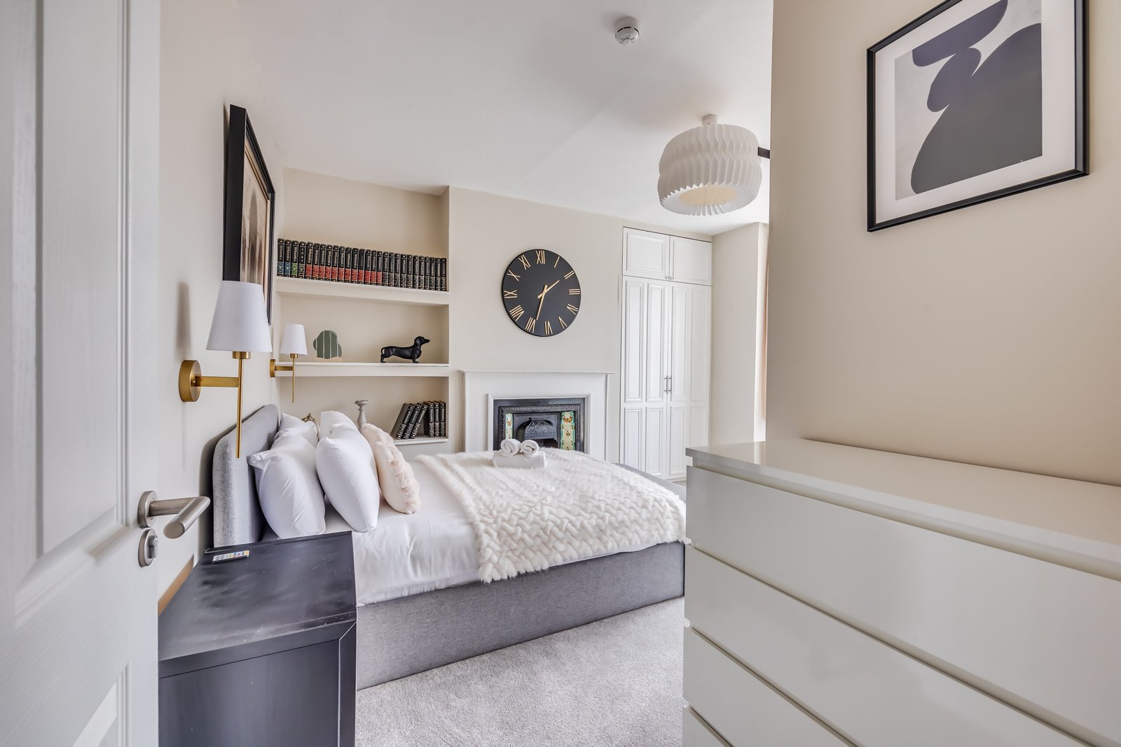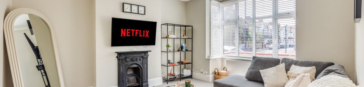 The ground floor includes a welcoming lounge with a feature fireplace, a cloakroom, and a dining room. A modern kitchen opens to a landscaped garden with a patio for outdoor relaxation or entertaining. The house features four bathrooms, ensuring convenience for larger groups. Each bedroom has comfortable double beds, with ensuite facilities in selected rooms. Additional amenities include a washer/dryer combo, a work desk, free Wi-Fi, and a Smart TV with Netflix and Disney+, making it suitable for corporate accommodation in Hammersmith. Private outdoor space enhances relaxation, and weekly housekeeping keeps the apartment fresh and ready.