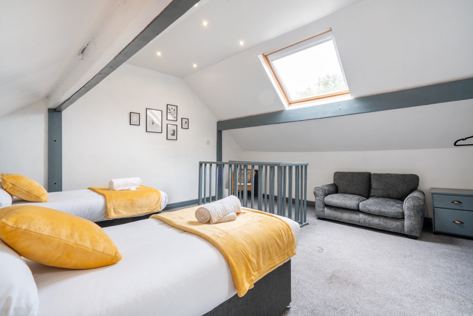Inside, the home offers thoughtful design across three floors. The ground floor hosts a cosy twin room, while two additional twin bedrooms occupy the first floor and another on the top floor. The bright bathroom features a sleek shower cubicle and fresh toiletries. The open-plan kitchen flows naturally into the dining area, creating a sociable space for shared meals or work catch-ups. In the lounge, a comfortable L-shaped sofa invites you to unwind after a day exploring Sheffield Botanical Gardens or attending meetings at Sheffield Hallam University.