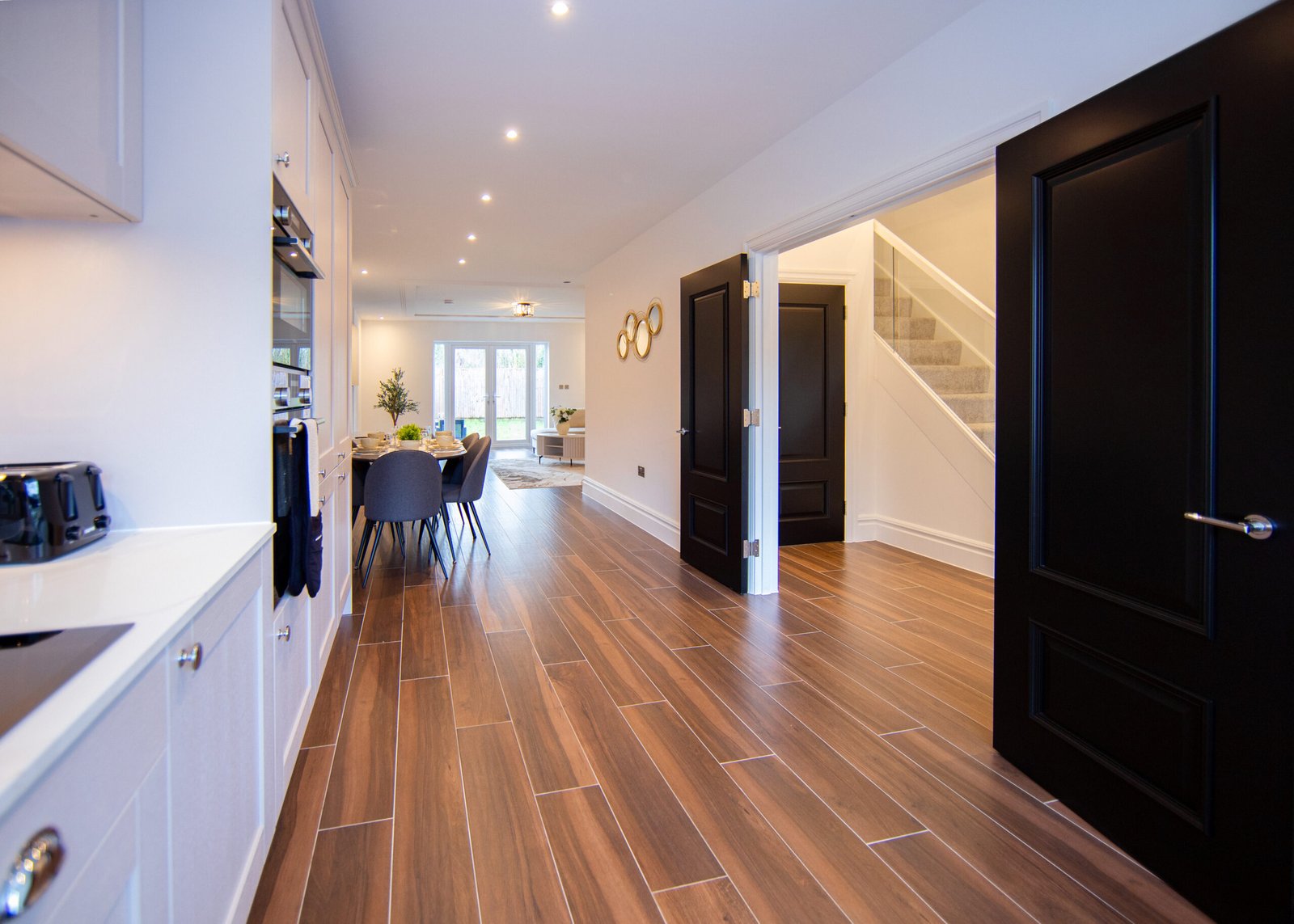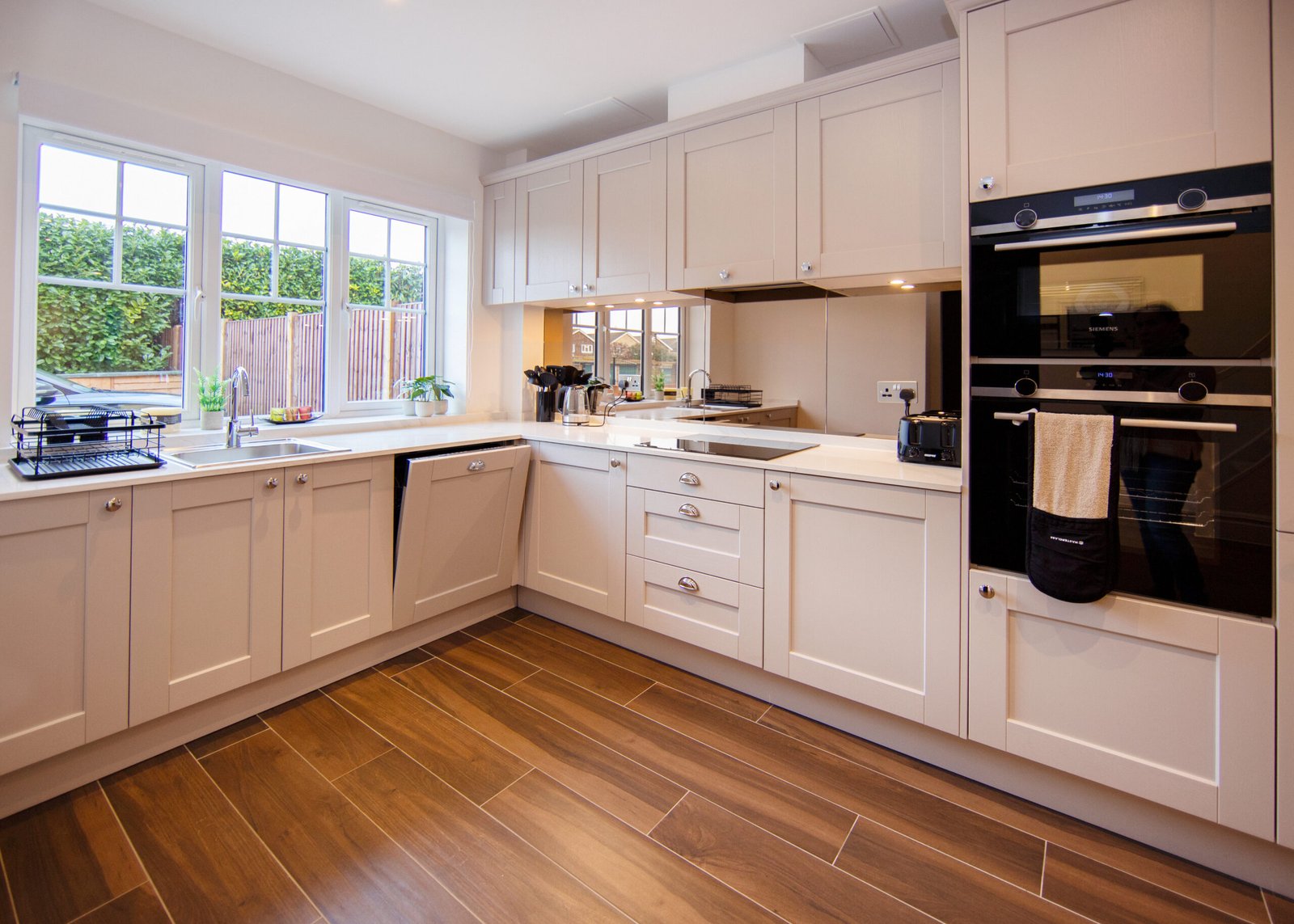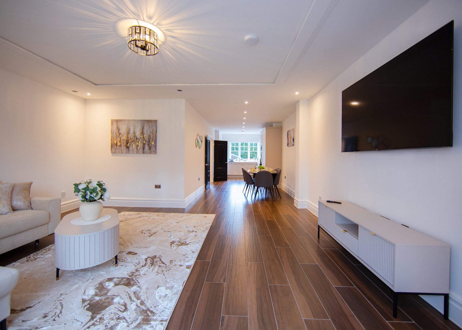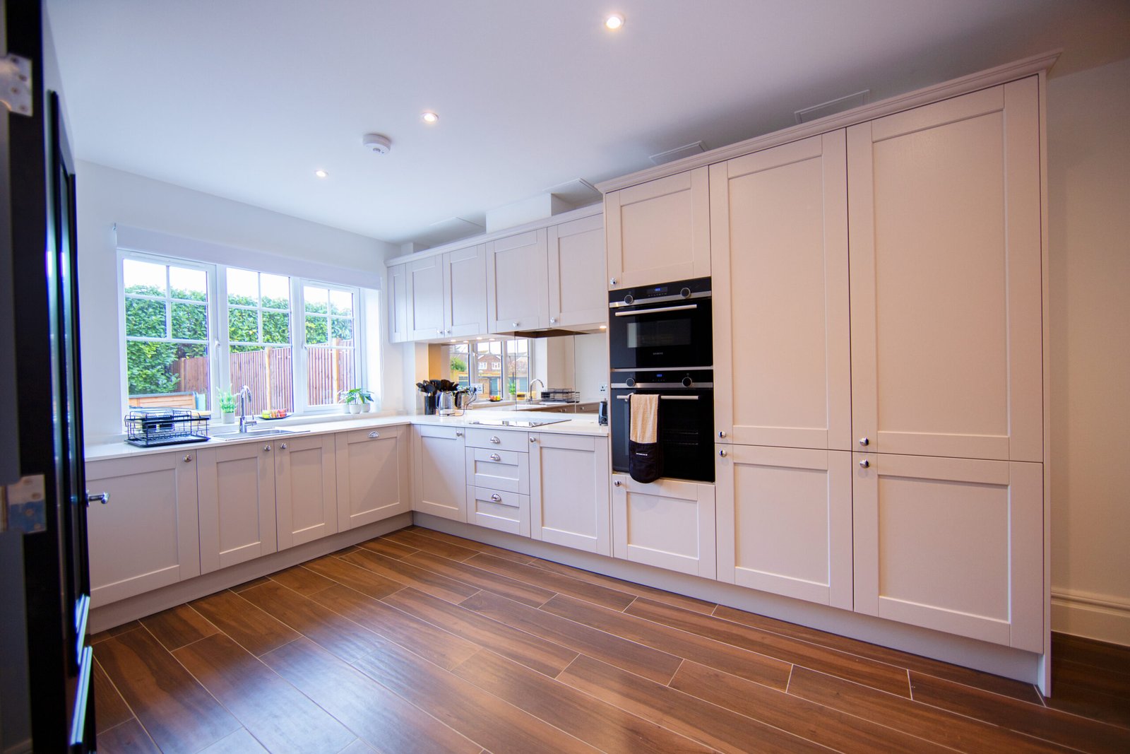 Guests relax in a comfortable lounge with Smart TV and high-speed Wi-Fi. The fully equipped kitchen includes modern appliances for easy self-catering. Upstairs, four double bedrooms offer en-suite bathrooms, while a single bedroom provides additional flexibility. Travellers choosing Windsor Holiday Homes benefit from space, privacy, and convenience.