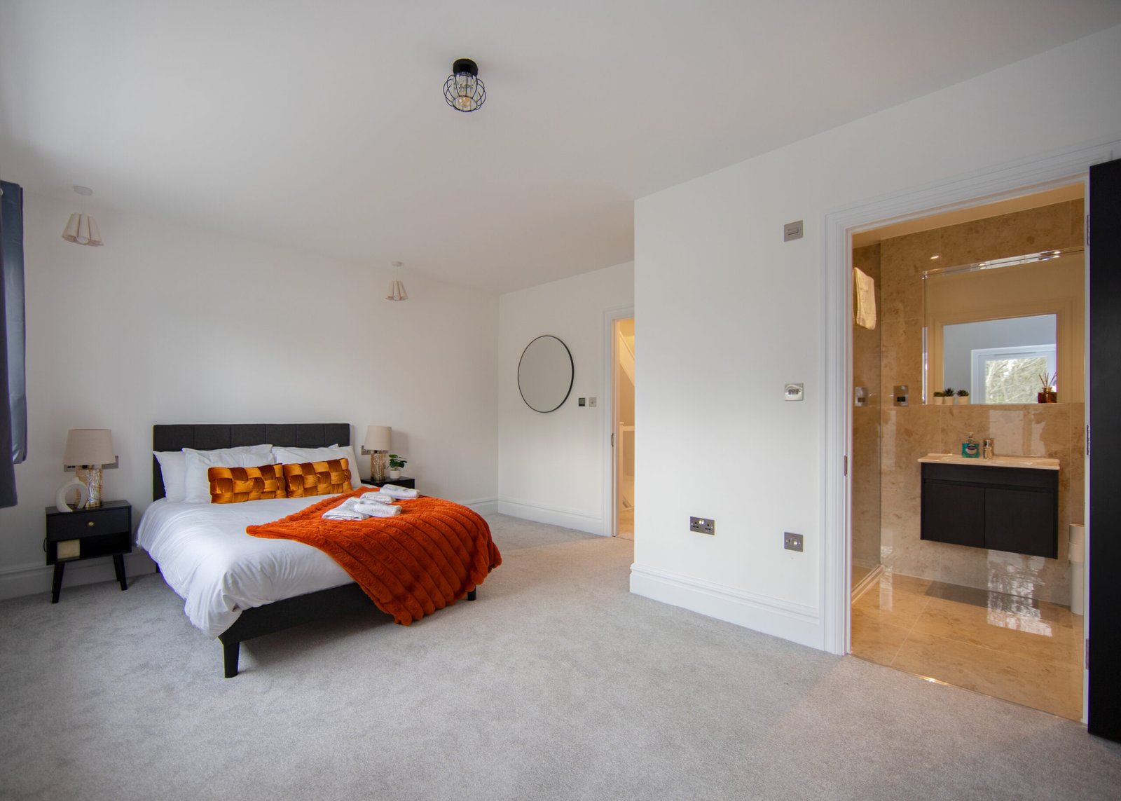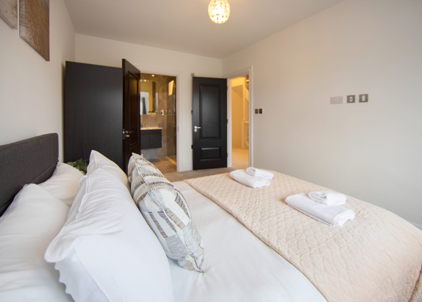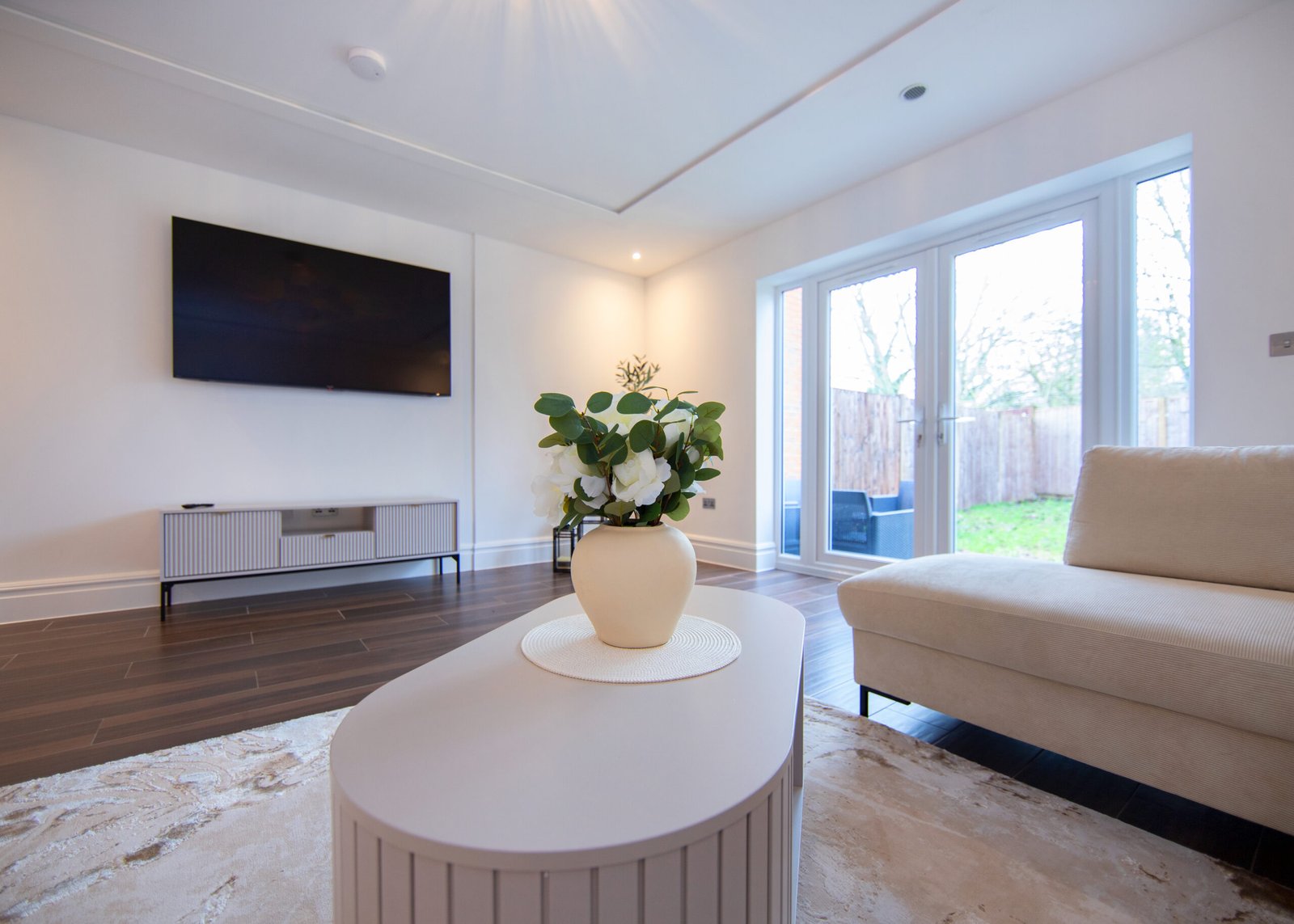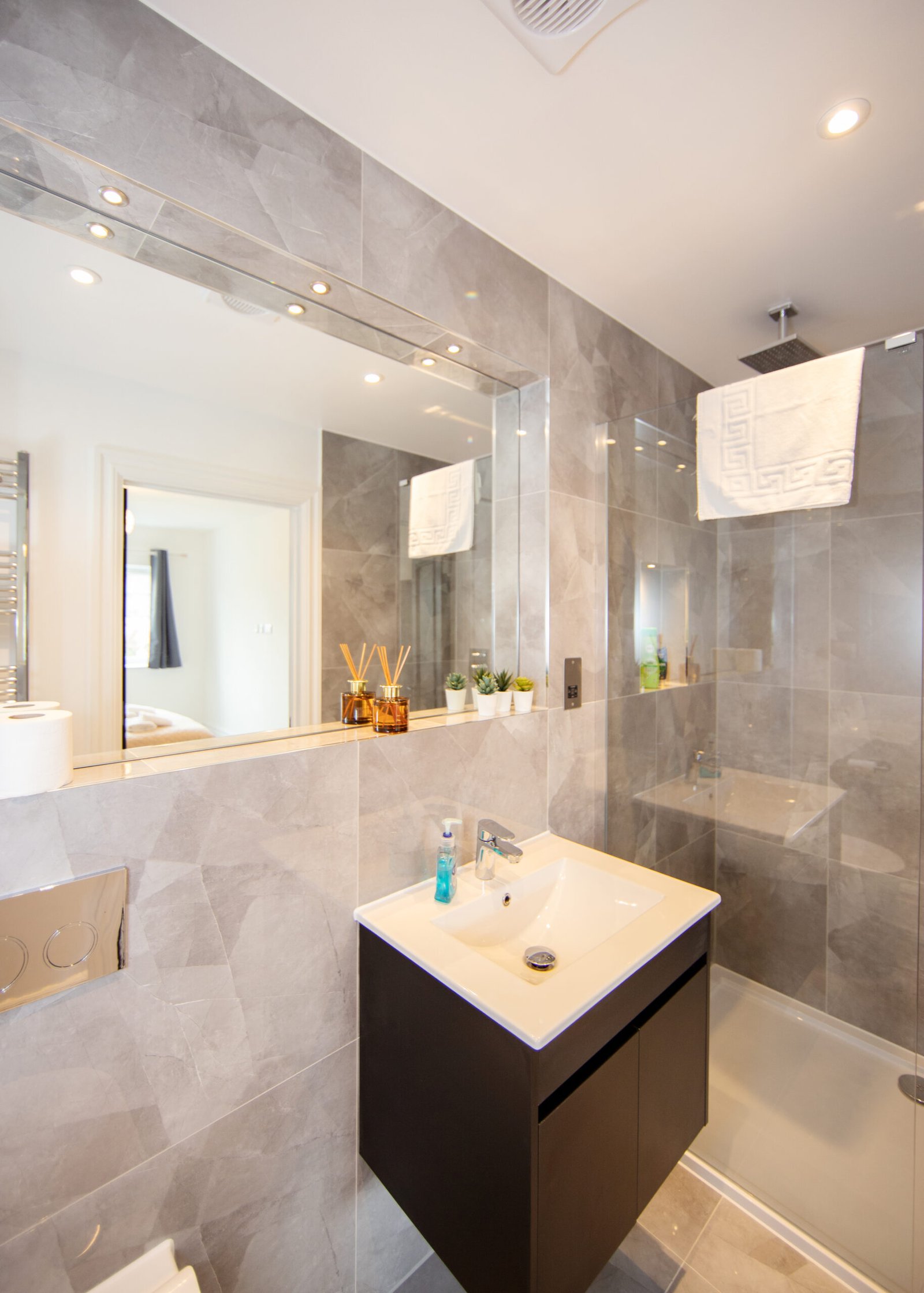 Guests relax in a comfortable lounge with Smart TV and high-speed Wi-Fi. The fully equipped kitchen includes modern appliances for easy self-catering. Upstairs, four double bedrooms offer en-suite bathrooms, while a single bedroom provides additional flexibility. Travellers choosing Windsor Holiday Homes benefit from space, privacy, and convenience.