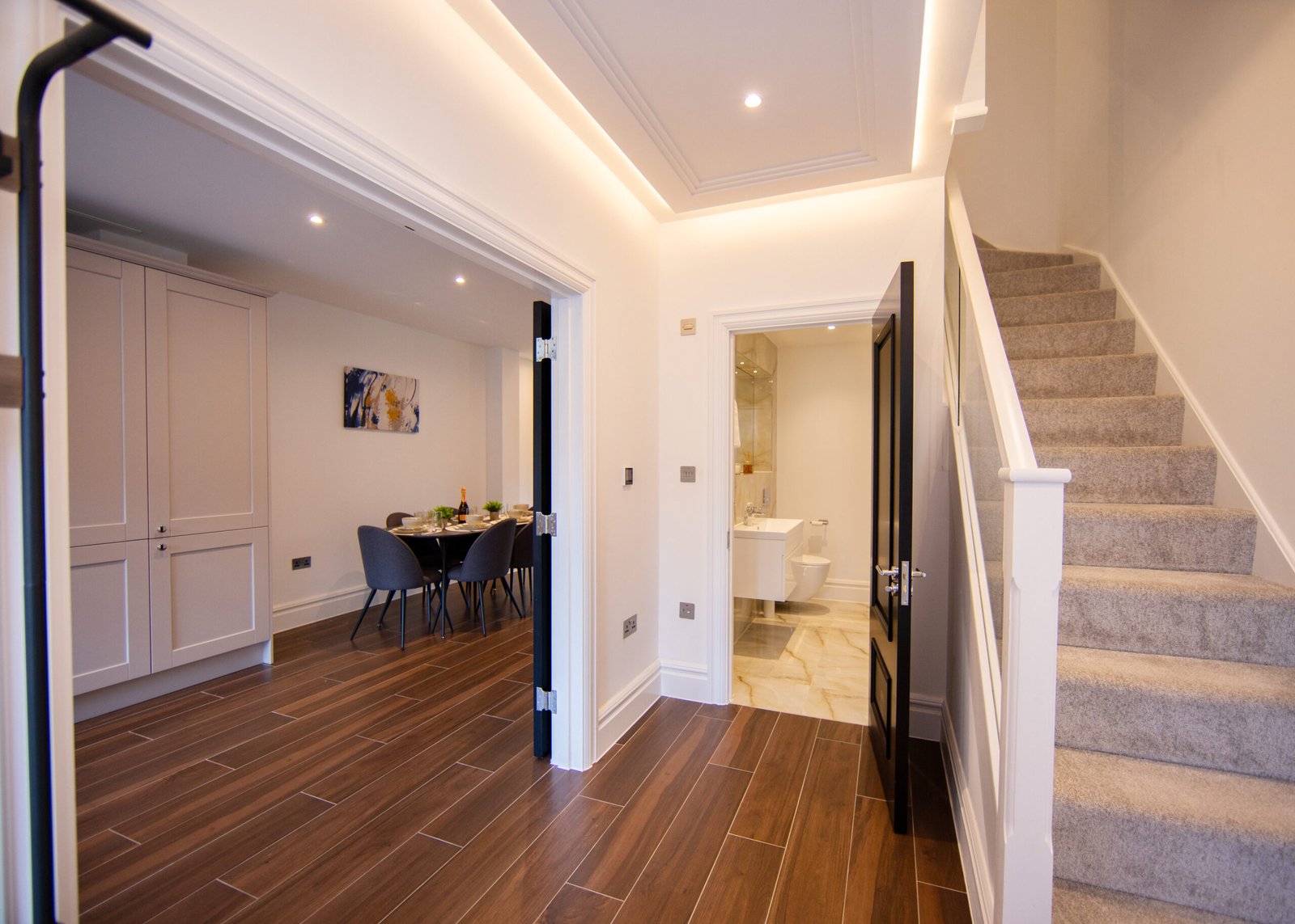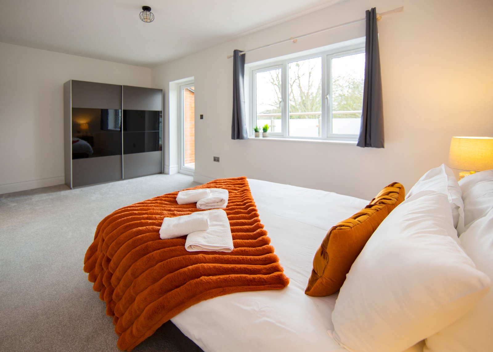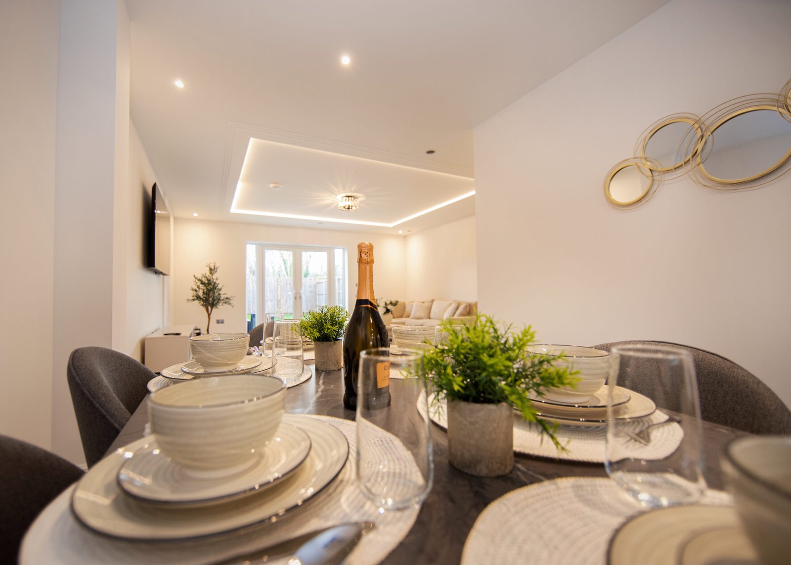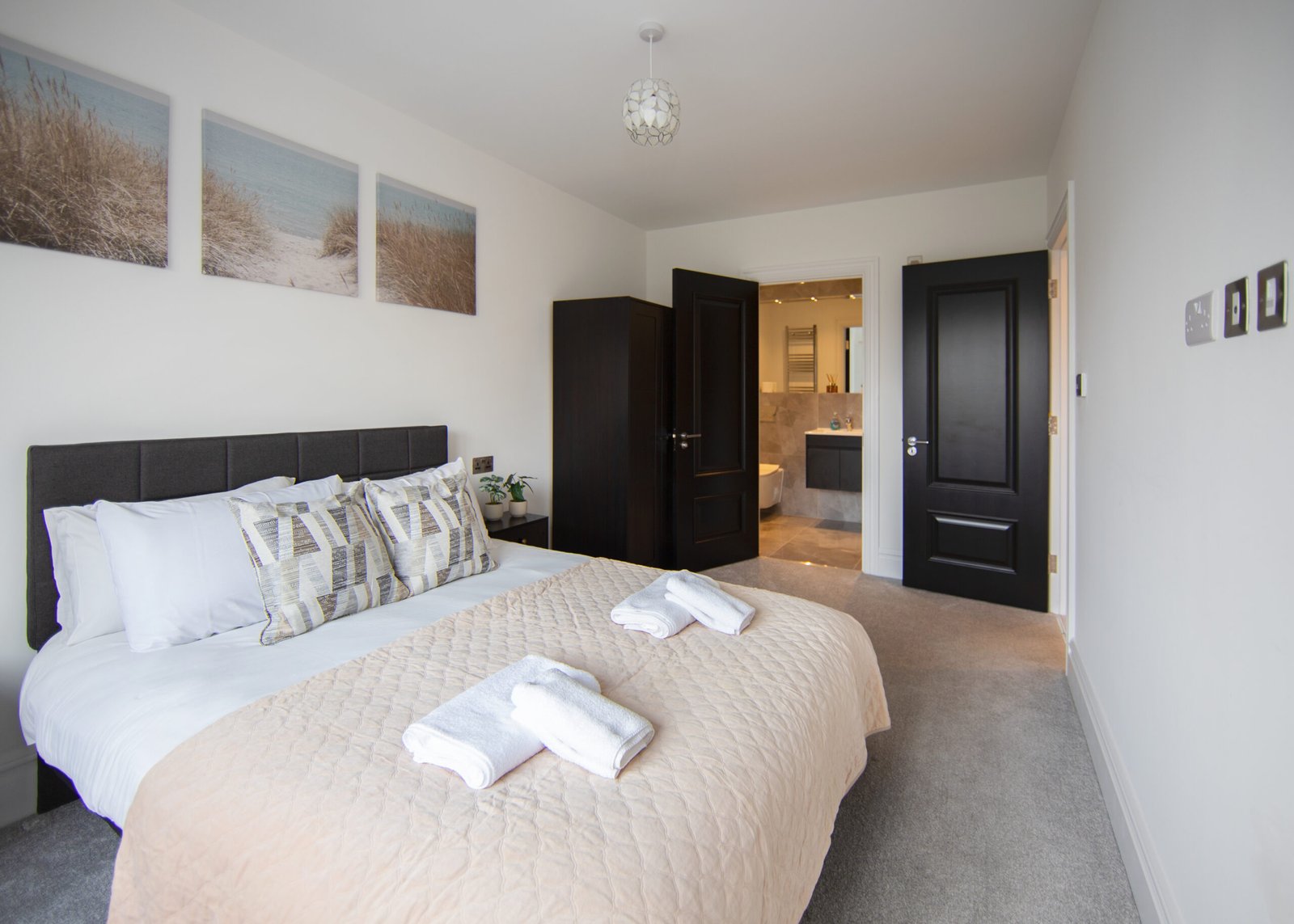 Guests relax in a comfortable lounge with Smart TV and high-speed Wi-Fi. The fully equipped kitchen includes modern appliances for easy self-catering. Upstairs, four double bedrooms offer en-suite bathrooms, while a single bedroom provides additional flexibility. Travellers choosing Windsor Holiday Homes benefit from space, privacy, and convenience.